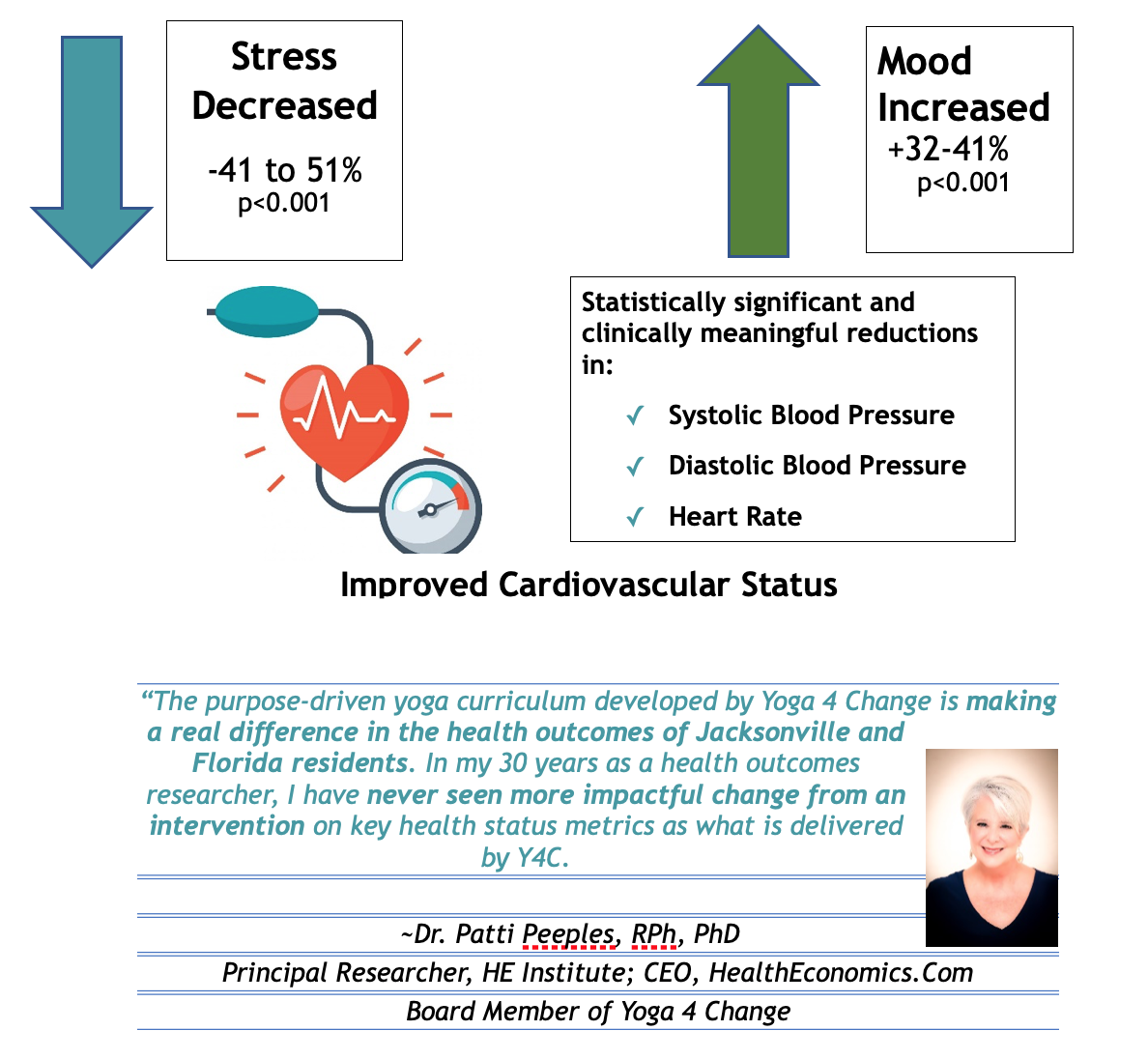 “The purpose-driven yoga curriculum developed by Yoga 4 Change is making a real difference in the health outcomes of Jacksonville and Florida residents. In my 30 years as a health outcomes researcher, I have never seen more impactful change from an intervention on key health status metrics as what is delivered by Y4C. ~Dr. Patti Peeples, RPh, PhD, Principal Researcher, HE Institute; CEO, HealthEconomics.Com, Board Member of Yoga 4 Change