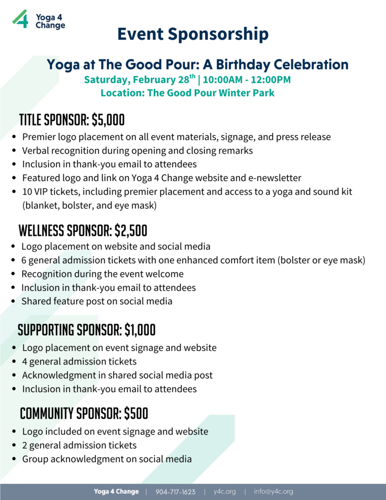 Support Yoga 4 Change and help us bring a yoga and sound experience to our Central Florida community! Your sponsorship or in-kind donation makes it possible to provide free, accessible health and wellness programming to those who need it most in our community.
